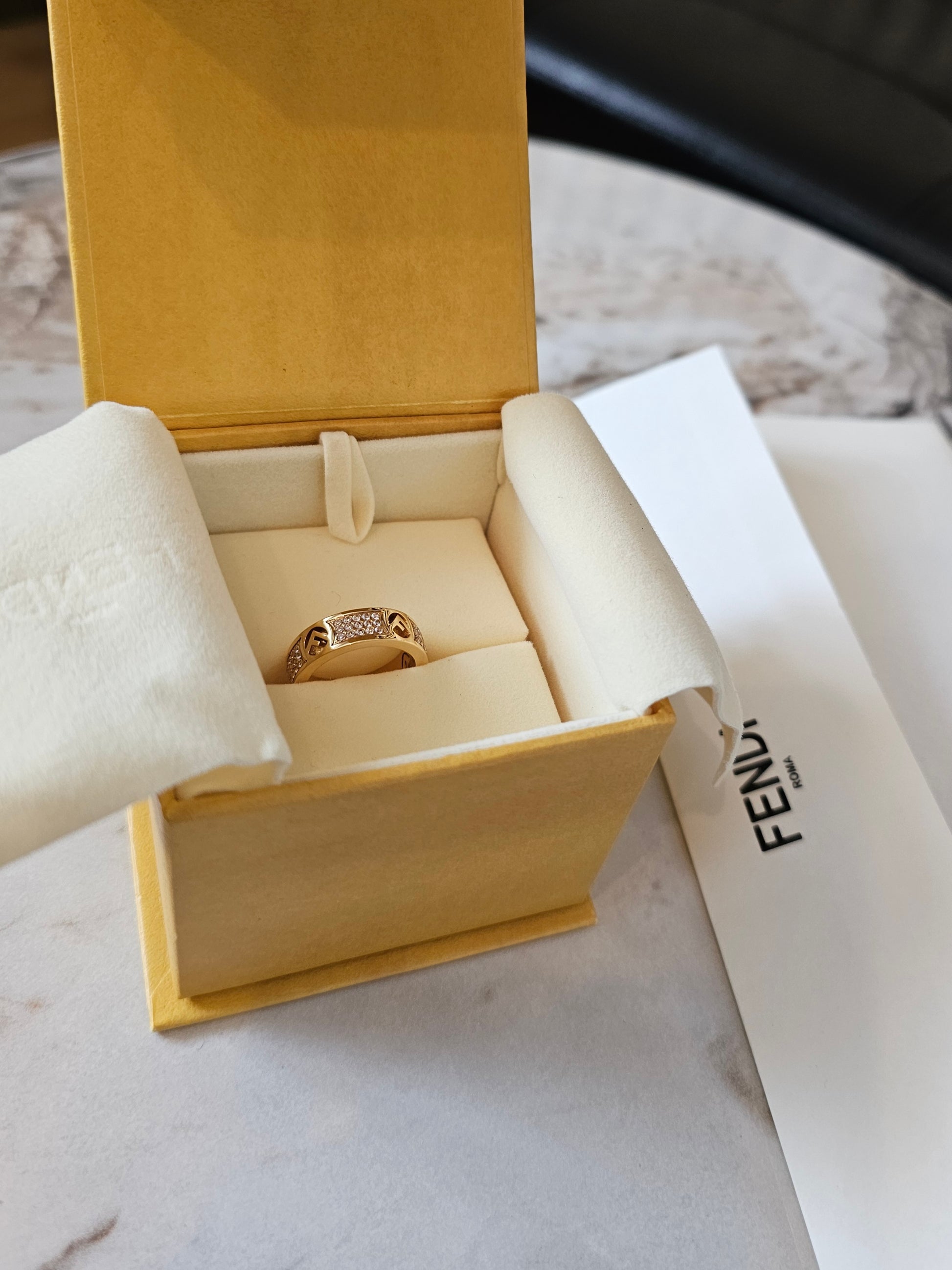 F- Fendi ring in golden with stones.